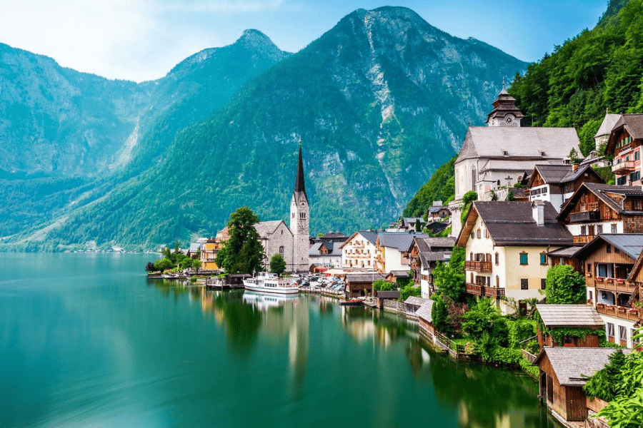 - Làng cổ Hallstatt (Áo) – được ví như là miền cổ tích, một trong những thị trấn trung cổ đẹp nhất tại Châu Âu. Ngôi làng có địa thế “tựa sơn, hướng thủy” vô cùng hoàn hảo theo quan niệm của phương Đông. Làng cổ Hallstatt tựa lưng vào dãy núi dãy Dachstein hùng vĩ và hướng mặt ra hồ Hallstattersee. Ngoài ra Hallstatt tập hợp những dãy nhà mang phong cách Holzhaus độc đáo nằm dọc bên hồ. Chính nhờ vẻ đẹp thở mộng ấy mà Hallstatt được mệnh danh là “Hòn ngọc nước Áo” hay “Xứ sở thần tiên”. Quý khách dừng chân chụp ảnh tại quảng trường Trung tâm; tản bộ trong làng ngắm nhìn thánh đường Hallstatt, tự do mua sắm những món quà lưu niệm thủ công sắc sảo, hoặc thưởng thức một tách cà phê tại quảng trường nhỏ cảm nhận không khí yên bình.