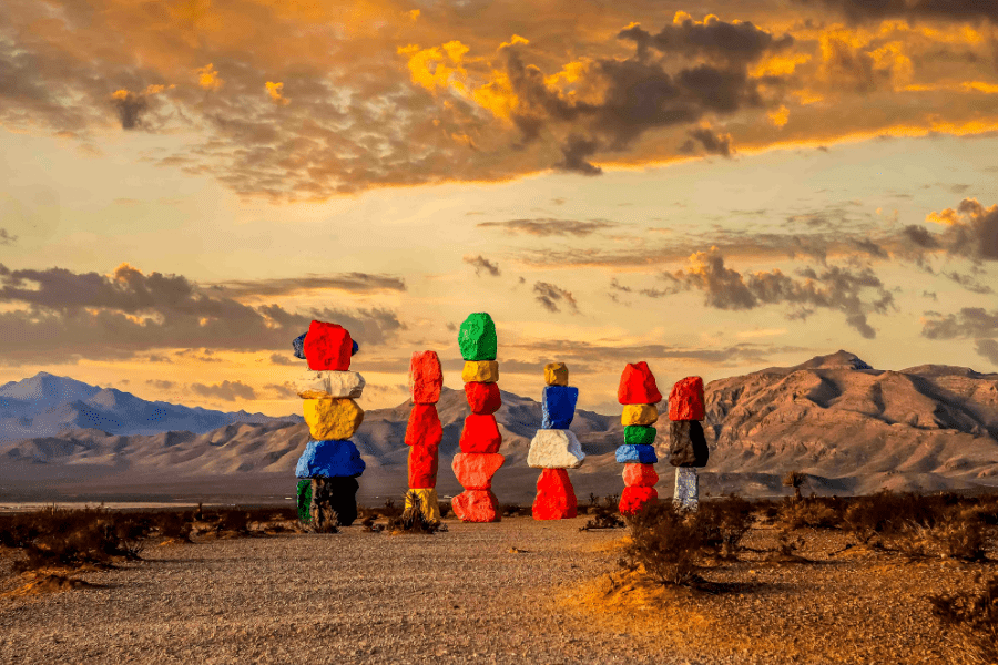 - Seven Magic Mountain – hay còn được biết đến với tên gọi công viên đá 7 màu là một tác phẩm nghệ thuật sắp đặt vô cùng độc đáo tọa lạc ngay bên cạnh xa lộ Interstate, thuộc khu vực phía Nam của Las Vegas. Điểm nhấn chính của công viên nằm ở 7 cột đá khổng lồ xếp chồng lên nhau một cách cực kỳ ngoạn mục. Để thực hiện được tác phẩm này, người ta đã phải sử dụng 33 tảng đá vôi cực lớn, mỗi tảng nặng từ 10 đến 25 tấn, xếp chồng chúng lên nhau tạo thành 7 tòa tháp, cao từ 9 đến 11 mét. Mỗi tảng đá lại được sơn một màu sắc khác nhau, tạo nên một vẻ đẹp rực rỡ khiến bất cứ ai khi đặt chân đến cũng phải ngẩn ngơ ngắm nhìn.