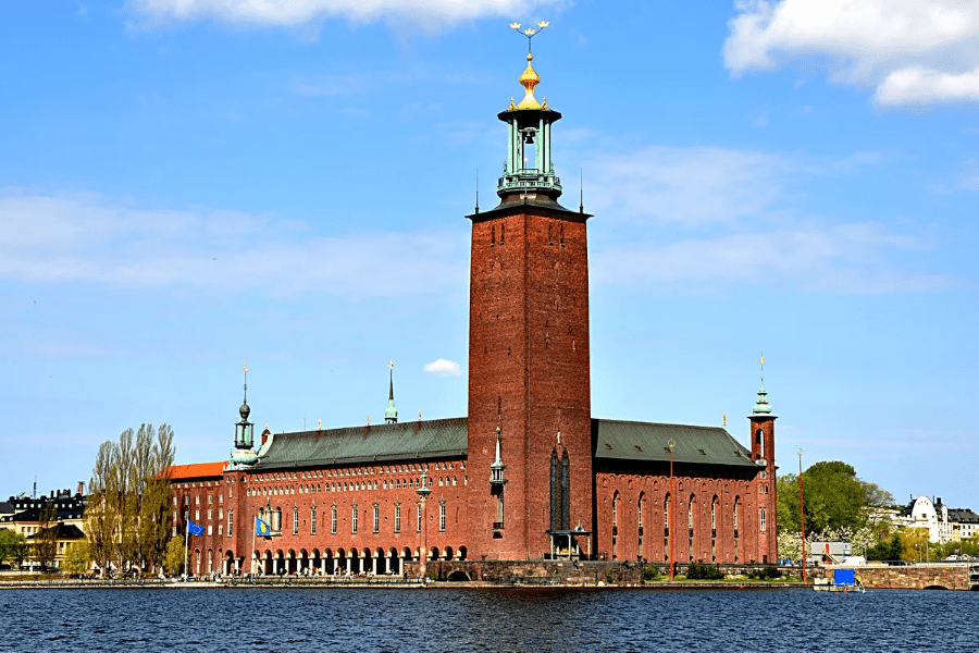- Tòa thị chính Stockholm City Hall – công trình bằng gạch đỏ nổi bật bên bờ hồ Mälaren, nơi diễn ra lễ trao giải Nobel danh giá. (Chụp hình bên ngoài – khu vực cầu Stadshusbron là điểm ảnh đẹp nhất mùa tuyết).