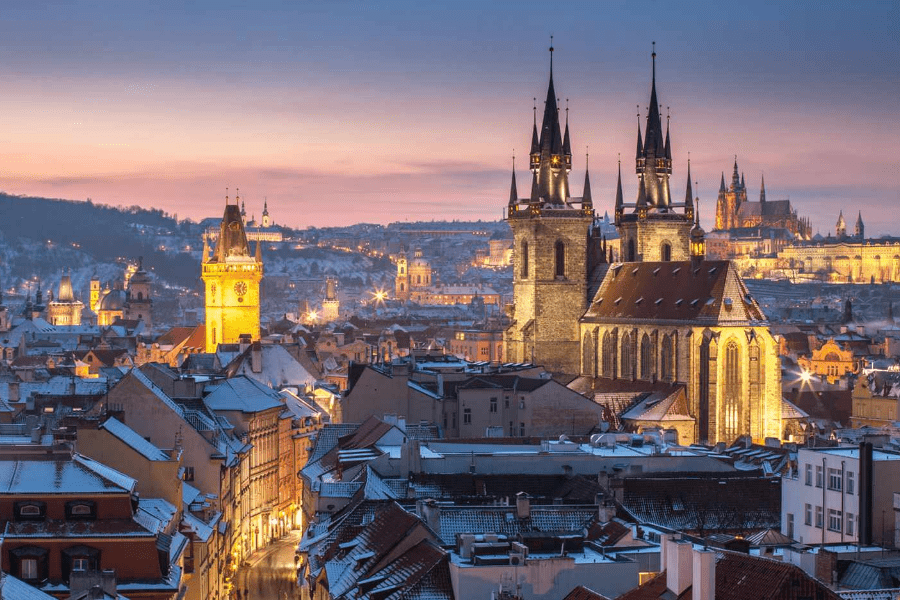Buổi trưa: Máy bay hạ cánh xuống Sân bay Prague, Quý khách làm thủ tục nhập cảnh. Xe đón và đưa Quý khách khởi hành tham quan Thành phố Prague – Thủ đô Cộng hòa Séc – không chỉ là trung tâm quyền lực của nước này mà còn ẩn chứa nhiều nét quyến rũ và hấp dẫn ở góc độ lịch sử, kiến trúc, văn hóa… Ngoài ra bạn sẽ còn thấy đâu đó bóng dáng của nhà hát kiểu tân cổ điển, nhà thờ kiểu barouque, các ngôi nhà kiểu Phục Hưng trong các khu phố cổ. Quý khách tham quan: