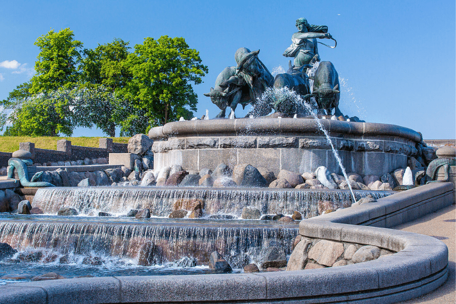 - Gefion Fountain – đài tưởng niệm lớn nhất ở Copenhagen và được sử dụng làm giếng cầu nguyện. Đài phun nước mô tả câu chuyện thần thoại về việc tạo ra hòn đảo Zealand, nơi tọa lạc của Copenhagen. Đài phun nước có hình nữ thần Bắc Âu Gefjun trên lưng một chú bò đực. Theo truyền thuyết, bốn chú bò thực sự là con trai của nữ thần; người đã giúp cô cày nát hòn đảo Zealand từ Thụy Điển. Nước trào ra từ lỗ mũi của con bò tượng trưng cho sức mạnh được dồn vào sự nỗ lực của họ. Nếu như đài phun nước lấp lánh dưới ánh sáng mặt trời vào ban ngày, thì vào ban đêm, nó có màu xanh ngọc làm tăng thêm tính chất huyền bí của di tích.