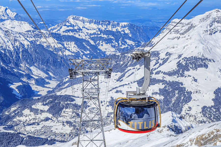 - Chinh Phục Núi Tuyết Titlis (không bao gồm vé cáp treo) – để chiêm ngưỡng vẻ đẹp hùng vĩ được tuyết bao phủ của dãy núi Alps. Du khách sẽ trải nghiệm cáp treo quay vòng Rotair – cáp treo xoay trọn vòng 360 độ đầu tiên trên thế giới, ngắm nhìn toàn cảnh núi tuyết tuyệt đẹp từ trên cao. Núi Titlis được mệnh danh là nơi thiên thần cư ngụ bởi không gian tuyết trắng bao la. Đi cáp treo lên núi tuyết, du khách sẽ cảm nhận rõ vẻ đẹp khác biệt, bắt đầu từ thảm xanh cỏ hoa, càng đi lên cao, cảnh quan chuyển dần sang một màu tuyết trắng của sông băng lượn quanh đỉnh Titlis.