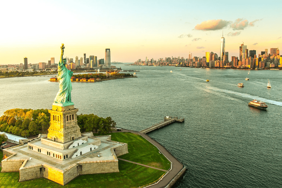 - Ngồi du thuyền tham quan Tượng Nữ Thần Tự Do – Biểu tượng của nước Mỹ, biểu tượng của tinh thần Mỹ – tinh thần tự do. Tượng nữ thần tự do tên đầy đủ là (Nữ thần tự do soi sáng thế giới) là một tác phẩm điêu khắc theo phong cách tân cổ điển với kích thước cực lớn đặt trên đảo Liberty tại cảng New York. Tác phẩm này do kiến trúc sư Frédéric Bartholdi người pháp thiết kế và được khánh thành vào ngày 28 tháng 10 năm 1886.