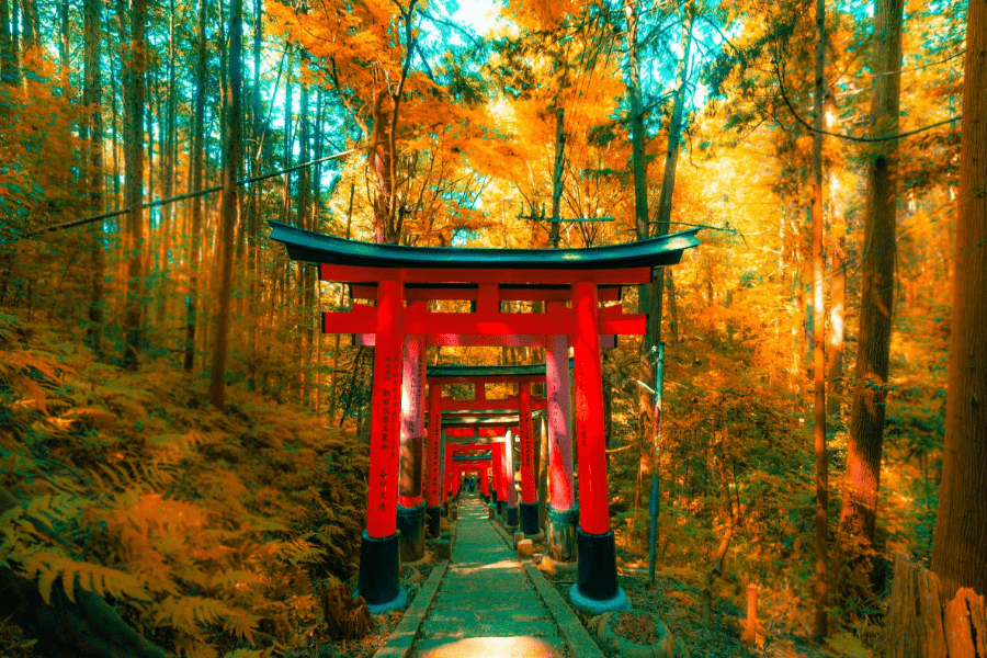 - Chùa nghìn cột Fushimi Inari – đây là ngôi đền thờ thần đạo nổi tiếng của Kyoto. Nơi đây nổi bật với hơn 1000 cổng Tori màu đỏ son, những chiếc cổng Tori này liên kết với nhau tạo thành những con đường mòn nằm phía sau khu đền chính. Những con đường này dẫn chúng ta đến với khu rừng rậm của ngọn núi Inari linh thiêng, ngọn núi cao 233 mét nằm trên đất của ngôi đền.