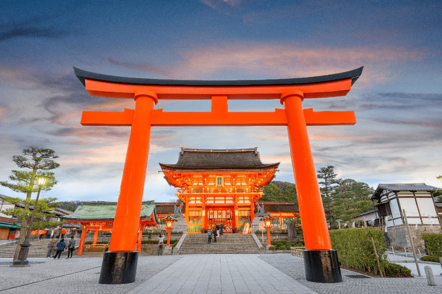 - Chùa nghìn cột Fushimi Inari – đây là ngôi đền thờ thần đạo nổi tiếng của Kyoto. Nơi đây nổi bật với hơn 1000 cổng Tori màu đỏ son, những chiếc cổng Tori này liên kết với nhau tạo thành những con đường mòn nằm phía sau khu đền chính. Những con đường này dẫn chúng ta đến với khu rừng rậm của ngọn núi Inari linh thiêng, ngọn núi cao 233 mét nằm trên đất của ngôi đền.